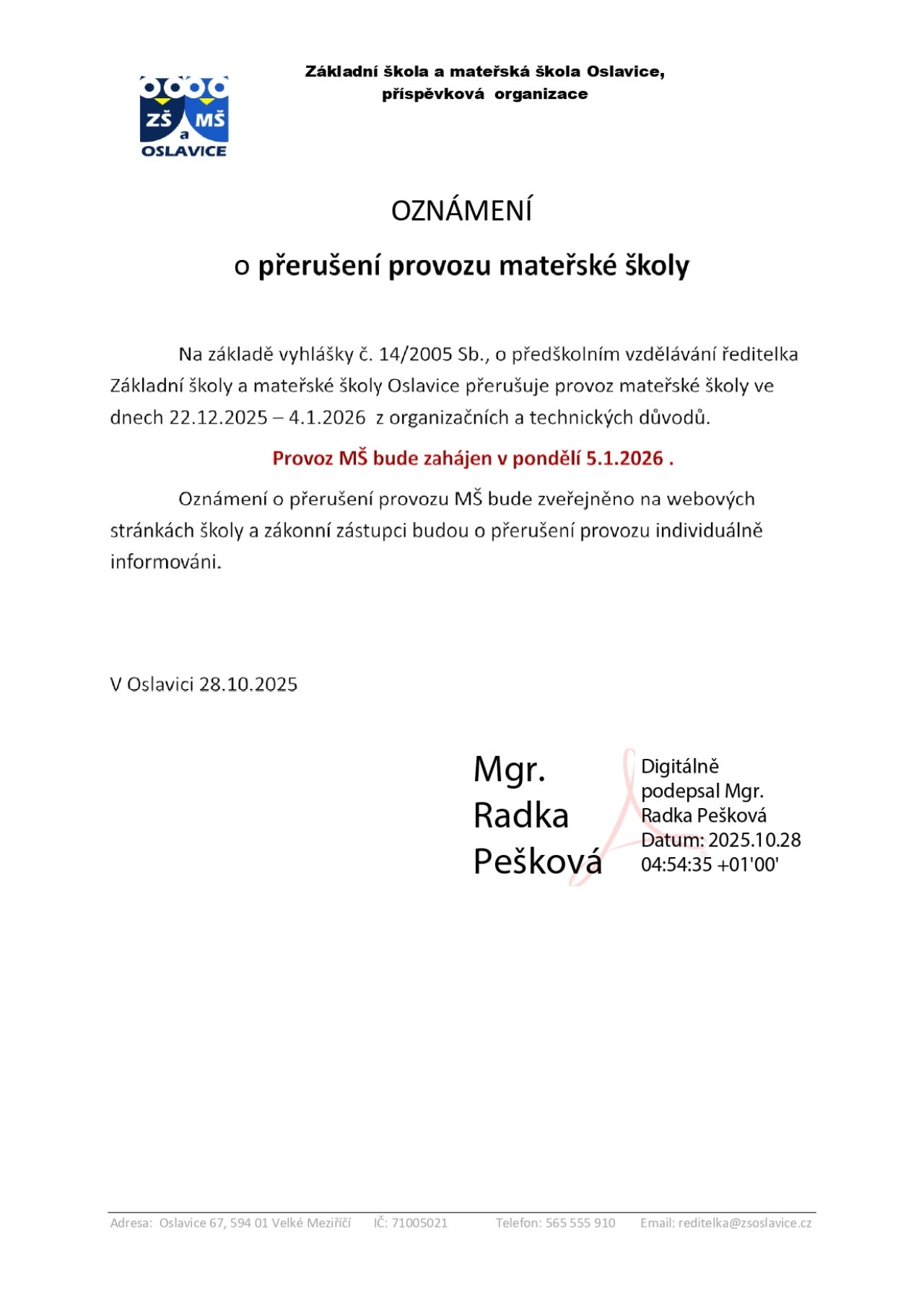 Oznámení o přerušení provozu mateřské školy během vánočních svátků